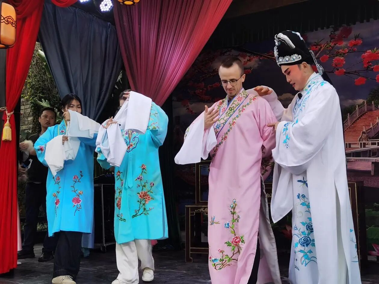 活动中,外籍友人在老师耐心指导下学习剪纸技艺;在包饺子环节,工作人员细致讲解饺子所承载的团圆寓意,并示范制作手法。现场还特设了新春书法体验活动,中外友人一同执笔挥毫,在红纸上写下满载祝福的春联,感受汉字艺术的深厚底蕴。此外,琼剧学唱、茶艺展示等非遗互动也吸引众人积极参与,中外友人换上琼剧戏服,模仿经典唱段,在欢声笑语中全方位领略海南传统文化的独特魅力。