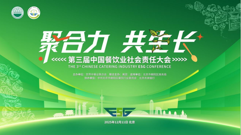 12月11日,由世界中餐业联合会主办,美团联合主办,北京市朝阳区商务局支持,中共北京市朝阳区餐饮行业委员会、北京农商银行商务中心区支行协办的“第三届中国餐饮业社会责任大会”在北京召开。大会以“聚合力,共生长”为主题,汇聚来自全国各地的240多名行业领袖、行业协会、企业代表、专家学者以及媒体人士,共同探讨在新时代背景下,餐饮业通过践行环境、社会和治理(ESG)理念,增强社会责任意识,实现企业、社会与环境的和谐共生,把握未来发展方向。