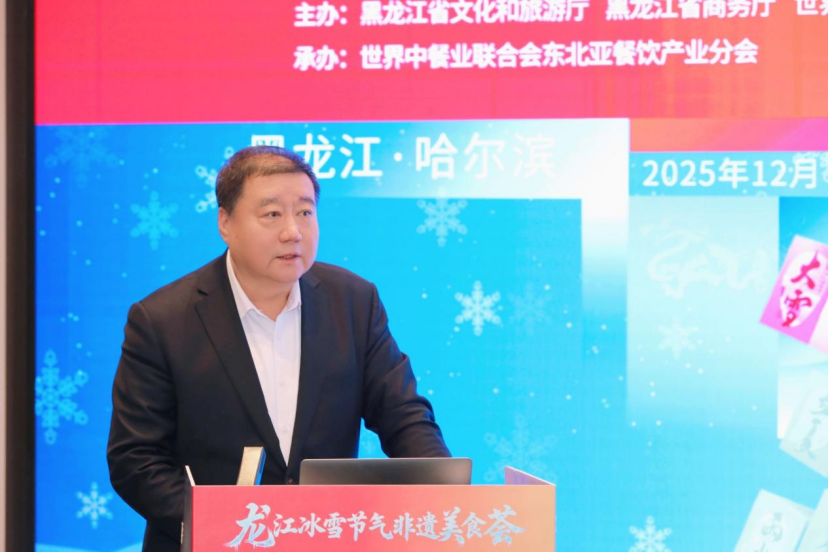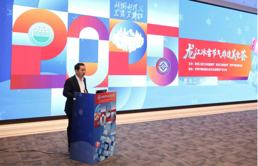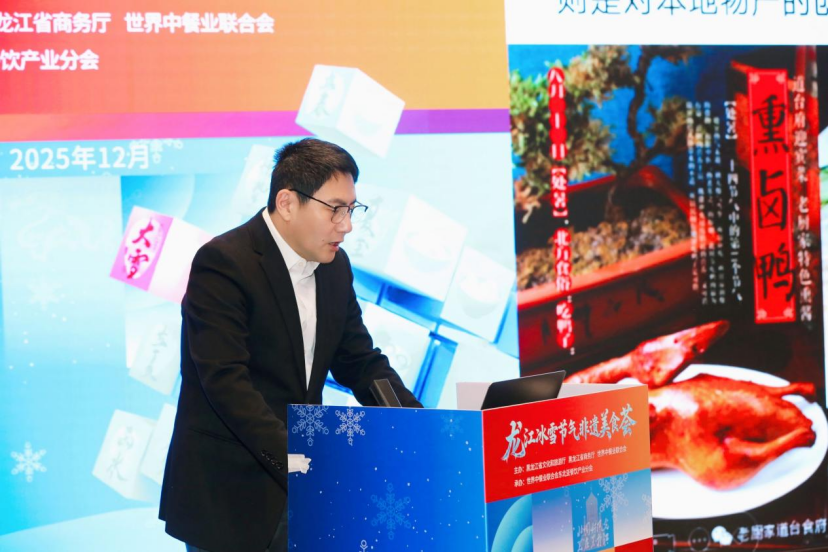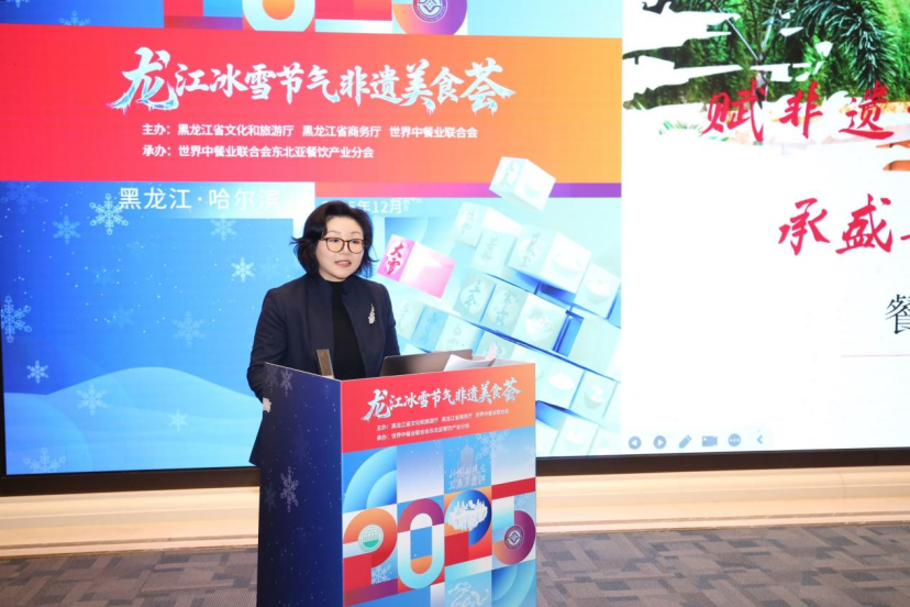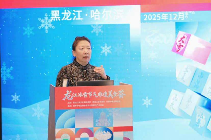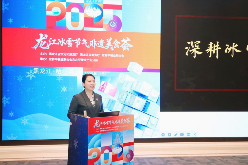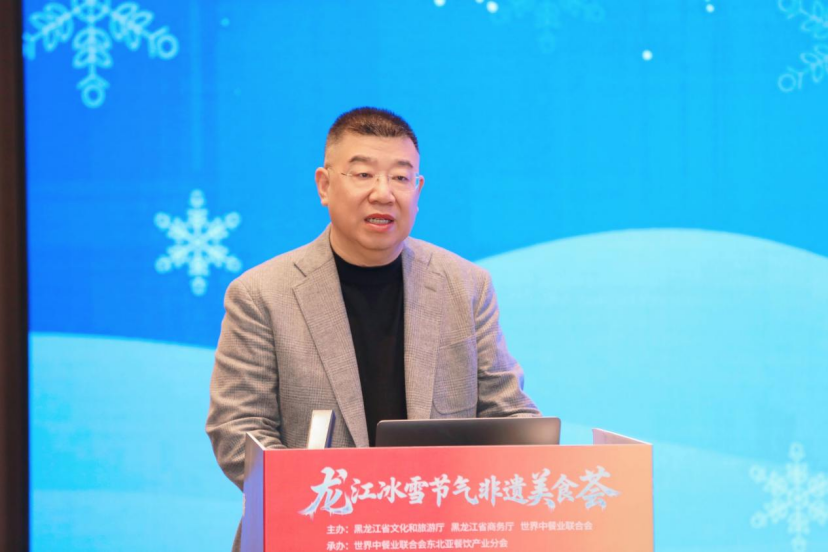 黑龙江省餐饮烹饪行业协会会长张金春,作了《冰雪滋味,龙江宴飨:当非遗美食遇见银装素裹》的主题分享,展示了龙江美食的冰雪特色。