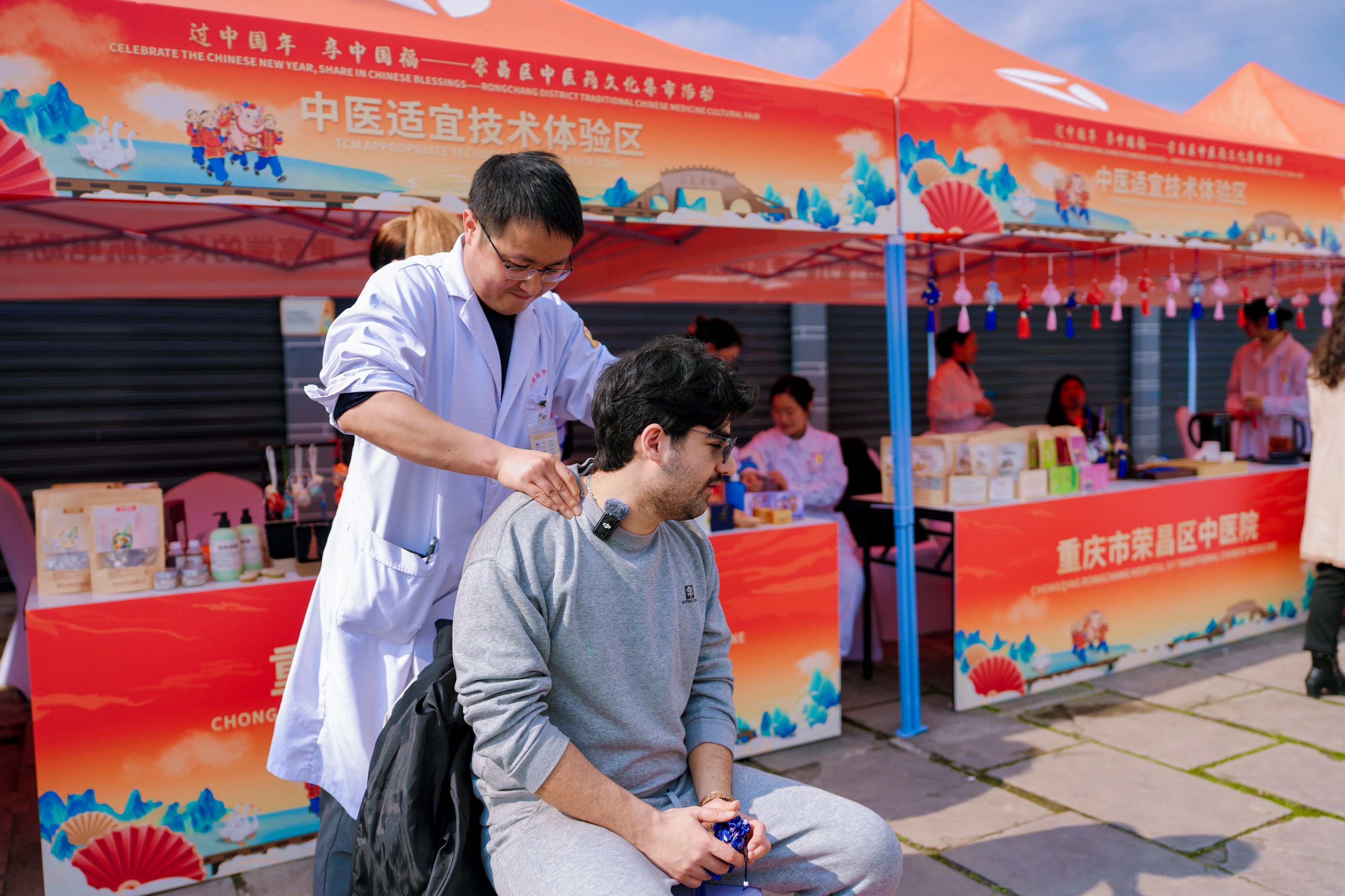 活动现场的新春年货集市,以“非遗+美食+文化”为核心,打造一站式巴渝年味体验地。非遗体验区,侨胞亲手体验荣昌陶器制作技艺,观摩精美的荣昌夏布文创和荣昌折扇作品,参与中医义诊;美食狂欢区,荣昌土猪肉香肠、荣昌卤鹅、灰水粽等特色小吃,搭配“渝味360碗”,一口唤醒乡愁;文化氛围区,书法名家写春联、手艺人秀糖画篾编,侨胞把年味和福气带回家。此外,活动创新打造“文旅+医疗”融合体验,为侨胞送上市卫生健康委指导建设的“渝悦医旅”专属健康礼遇,三大健康套餐配备健康管家、专车接待和中英双语服务,让侨胞在过年的同时,享受家乡的专业健康呵护。