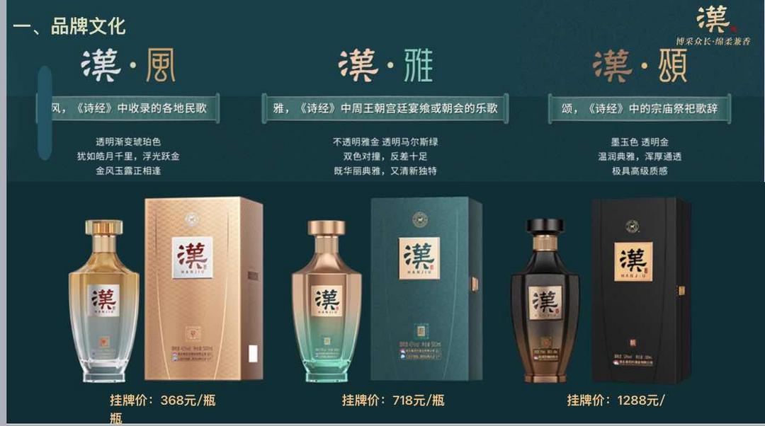 在文化方面,汉酒巧妙融入丰富的汉文化元素,“汉"风”“汉" 雅”“汉"颂”源起《诗经》中的“风雅颂”,将古典文化与现代审美相结合。汉酒瓶型设计灵感源自“汉代青铜钫”,徽标上的“汉隶”字体古朴醇厚,汉代青铜纺的灵感和汉隶字体的醇厚苍劲,共同诉说着汉文化的深厚底蕴。系列瓶身之色,分别采用琥珀、金玉、墨玉等瑰宝色彩演绎,展现出中华传统美好寓意。